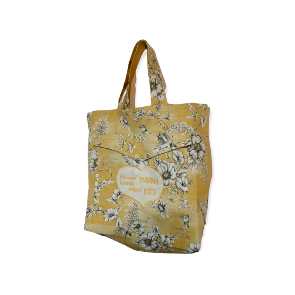 Koti materjalidena kasutame ära puuvilla- ja linaseguste kangaste jäägid, mistõttu ühesuguseid kotte palju ei leidu. Tikandi osas saate alati oma sõna kaasa rääkida ning kotikest isikupärasemaks muuta. Riidest kotil on ees peal üks tasku, mis on trukiga suletav.