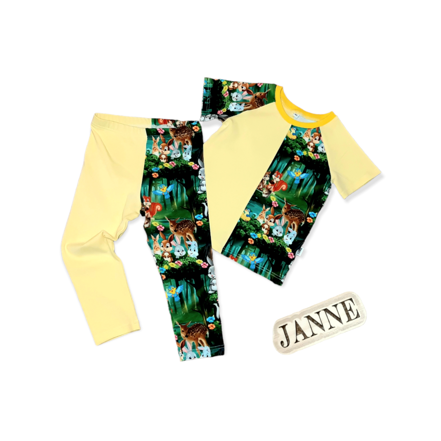 Toredate metsaloomadega erilise disainiga komplektike suurusele 92cm. T-särk on stiilselt pool imearmsate metsaloomadega eest ja tagant. Retuusid on samuti pool kollase ja pool mustrilise kangaga, keskkohas pehme kumm.