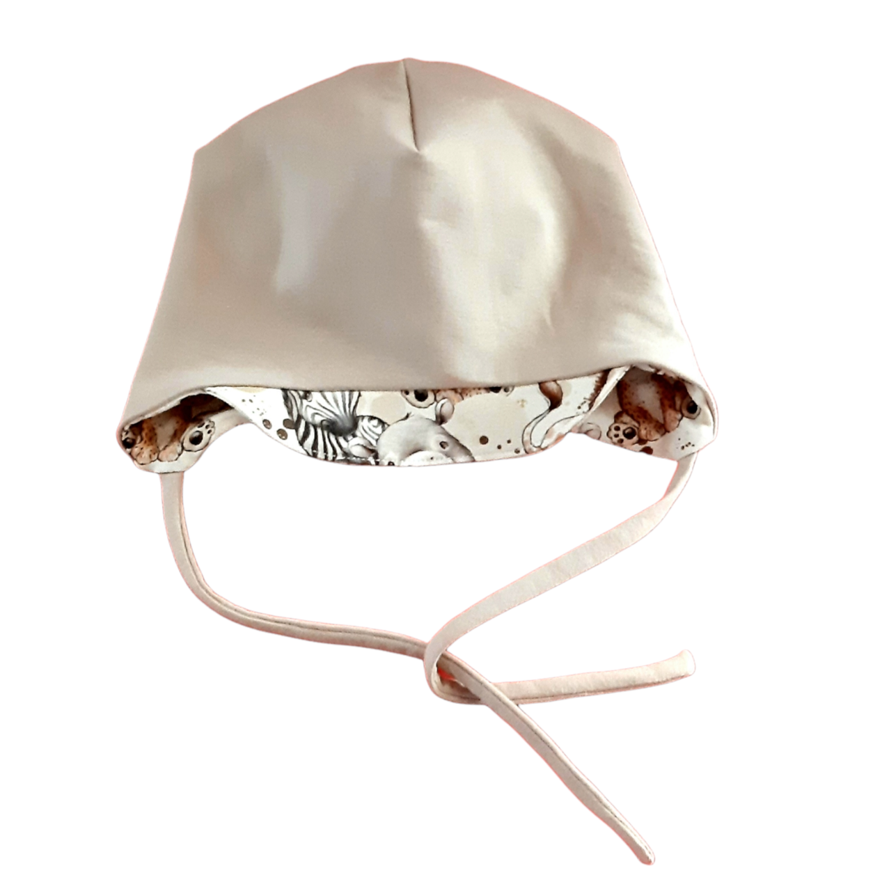 Kevadmüts TIM on väikese nokakesega pehme topelt puuvillane mütsike. Paeltega seotav peakate püsib hästi peas ning hoiab kõrvad kaetud. Sobilik kanda nii kevadel kui sügisel. See mütsike on mõnusalt pastelses beežis toonis, mis sobib hästi paljude riietustega. Voodriks seekord kirju, loomakestega muster. Kuna mütsil puuduvad sildikesed, siis võib seda vabalt ka teistpidi kanda.
