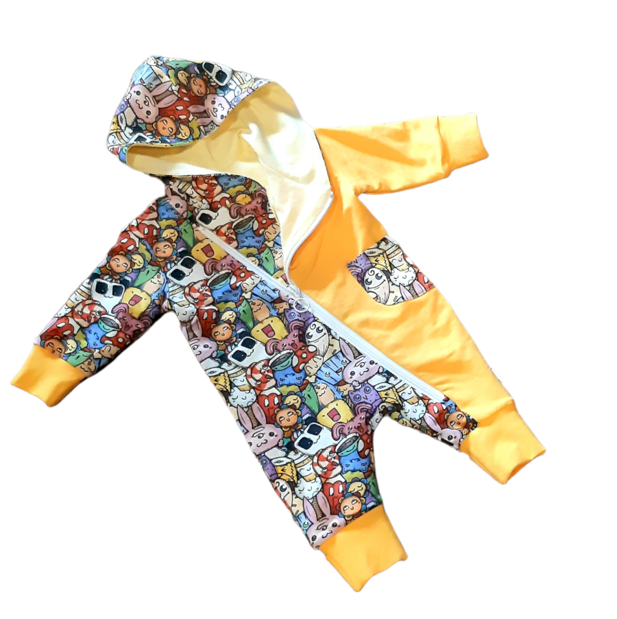 Kombe üks hõlm ja varrukas on erkkollased, ülejäänud kombe on kirju kangaga, kus kõik värvid on oma ilus esindatud. Voodrina on kasutatud pisut heledamat tooni. Kapuuts on mõnusa disainiga, kus üks hõlm katab teist, mis annab eriti hea kaitse tuule eest. Kõik käe- ja jalaotsa soonikud on valmistatud tagasipööratavad ehk vajadusel saab nii käekesed kui jalad kenasti kinni katta. Lapse kasvades aga saab kinnaste-papukeste lisades riietust päris pikalt kasutada.