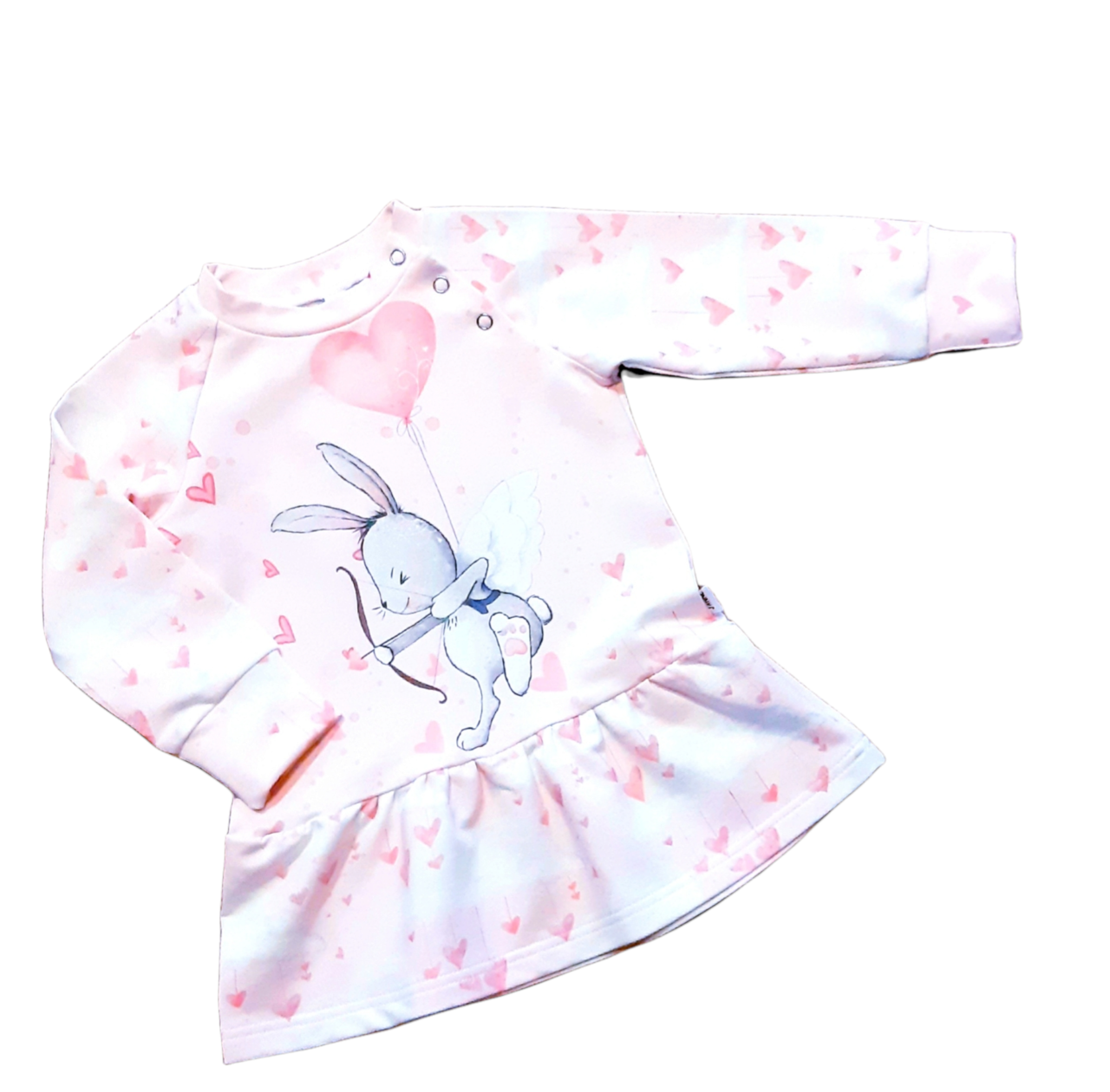 Imeline jänes, seljas inglitiivad, südamete keskel - tõeline armastuse Valentin. Armas roosa tuunika kõige pisematele printsessidele. Pusakleit on valmistatud pehmest naturaalsest dressikangast (koostisega 95% puuvilla ja 5% elastaani) ning omab Öko-Tex100 sertifikaati. Kleidike on mugava lõikega, mistõttu sobib kõigile. Pikad varrukad on võimalik vajadusel üles keerata, et kandmisaega pikendada. Trukk-kinnis vasakul õlal tagab lihtsa ja kiire riietumise. Satsike allääres annab kelmikust ja särtsu. Pusa asemel pükste peale või kleidina sukapükstele - igas variandis imeline.