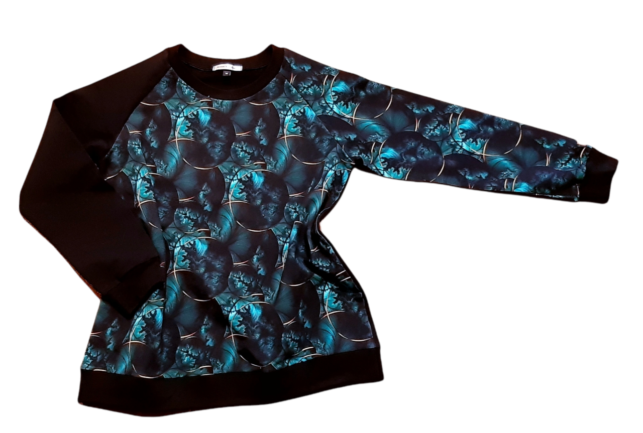 Mustrilise vasaku varruka ja esiosaga pusa on klassikaline mudel, mille parem varrukas ja selg on musta värvi.