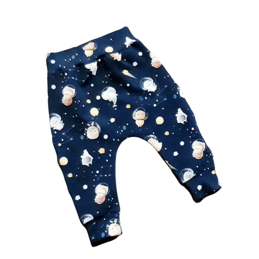 Pisikesed loomabeebid avastamas kosmoses universumit ja kõik nüüd imetlemiseks pükste peal. Klassikalised keskkohani baggy stiilis püksid beebile. Mugavad puuvillasest dressikangast (95% puuvilla ja 5% elastaani), mis omab Öko-Tex100 sertifikaati.