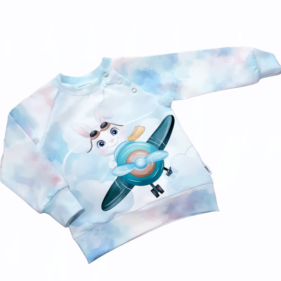 Vallatu ja vapper jänes oma lennukiga pilvedes. Võtame ette rohkelt seikluseid ja tervitame rahvast üle terve maakera. Pehme pusa PLAY sobib suurepäraselt komplekti pükstega HOP.