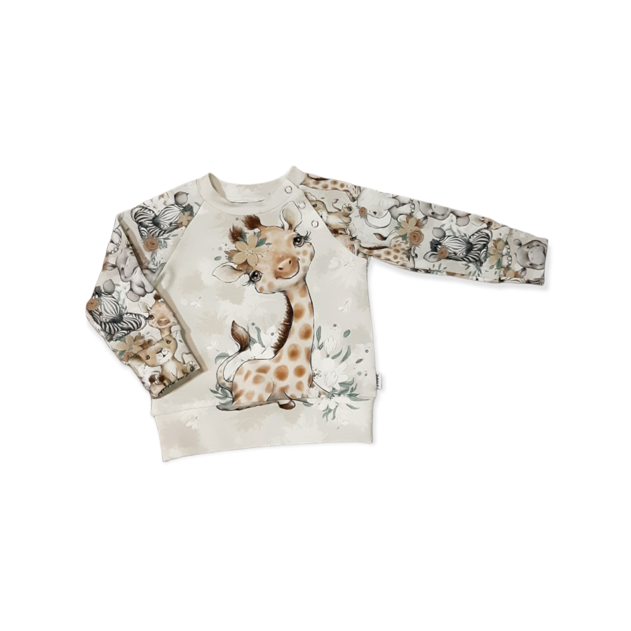 Kauni dressipluusi kõhul on armas loomabeebi. Pehmest materjalist Öko-Tex100 sertifikaadiga kangas on koostisega 95% puuvilla ja 5% elastaani naturaalne sinu naha vastas. Pluusi õlal on lisatud trukk-kinnis, et riietumine kiiresti edeneks.