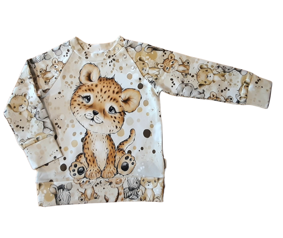 Pisikese kindlameelse pilguga tiigrikutsika pilt pusa kõhul toob naeru näole ning päev muutub ilusaks. Seiklused, kui seljas on loomabeebide dressipluus, muudavad iga väikese inimese tegusaks. Kiireks riietumiseks on pluusi õlale lisatud trukid. Soonikud varruka otstes annavad pusast rõõmu saada pikema aja jooksul.