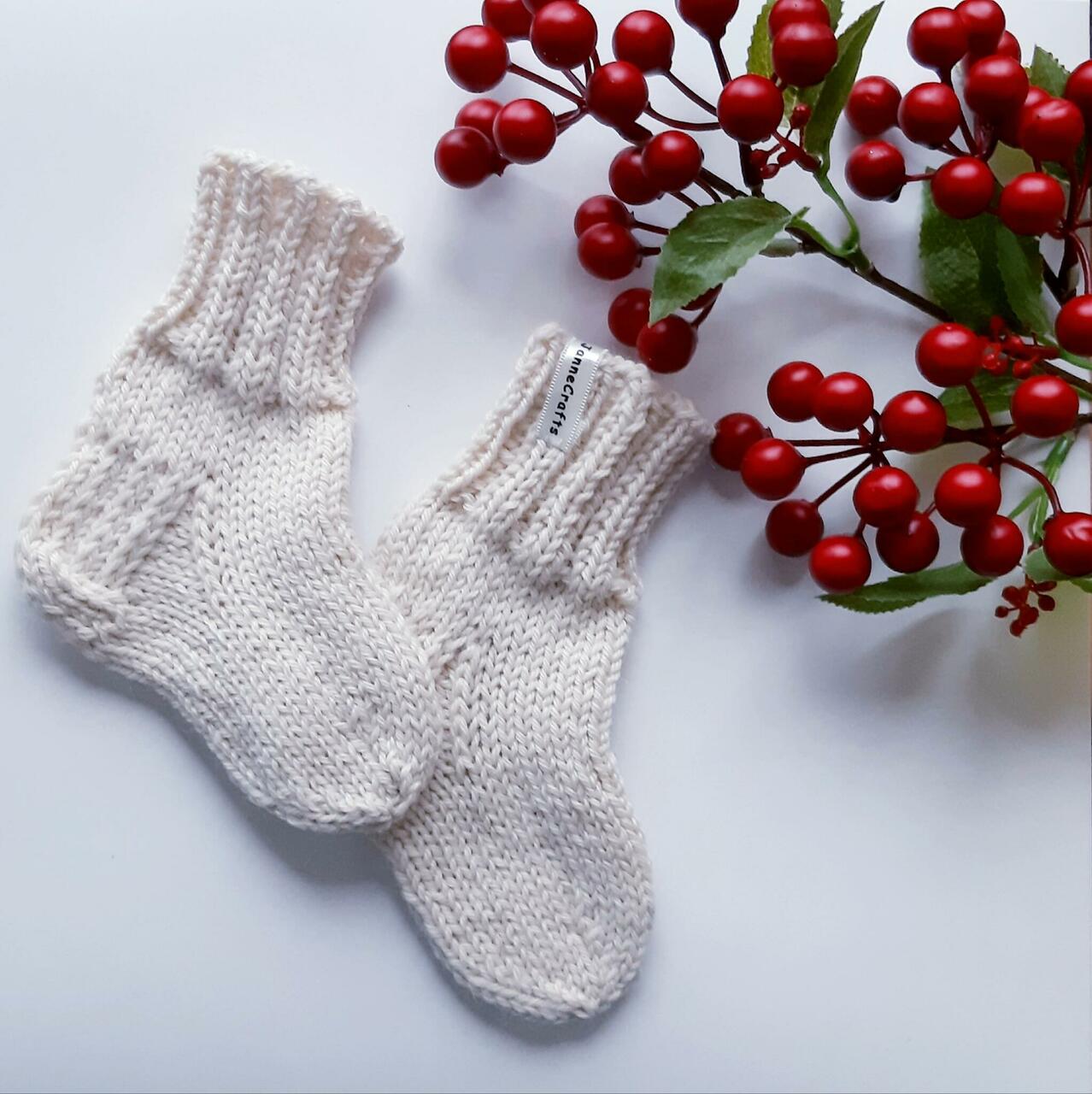 Naturaalvalgest lõngast klassikalised sokikesed. Kuni suuruseni 12-13cm (1-2.a.) lisame kaasa nöörikesed. Nööri saab vajadusel põimida läbi sokisilmade, et magamiskotis või vankris teki all need jalast ei tuleks.