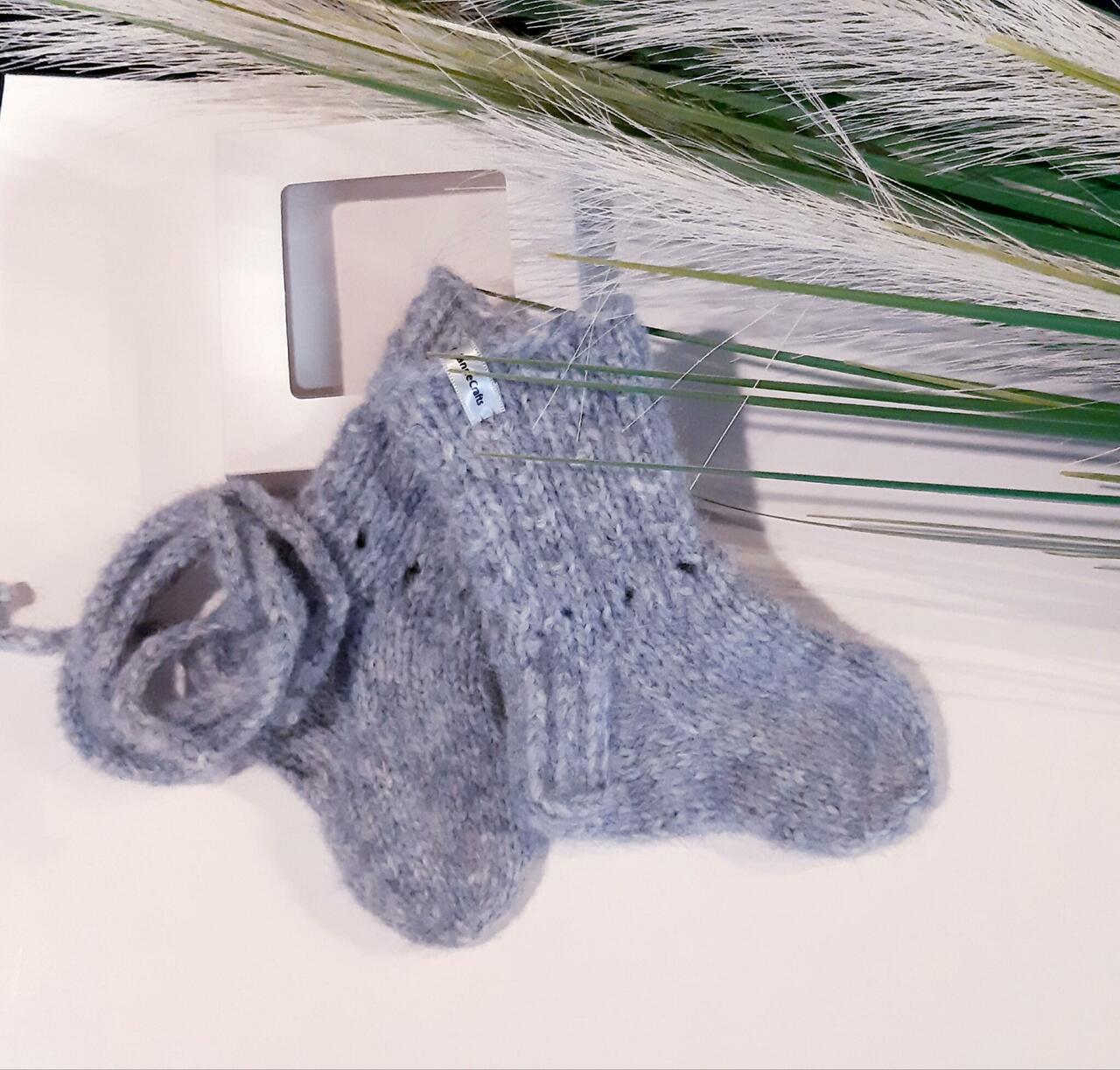 Hallist lõngast sokikesed on ülevalt pitsilise koekirjaga. Lisame kaasa nöörikesed, mille saab vajadusel põimida läbi spetsiaalselt kootud rea aukude, et magamiskotis või vankris teki all need jalast ei tuleks.
